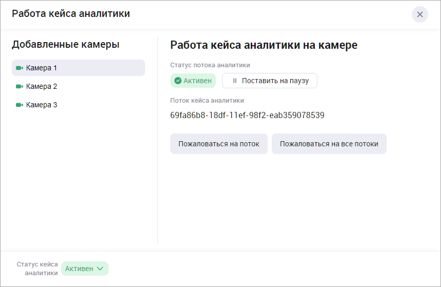 В нижней части панели отображается статус кейса аналитики. Вы можете поставить на паузу кейс аналитики в статусе «Активен». При этом все активные потоки аналитики всех камер приостанавливаются.
