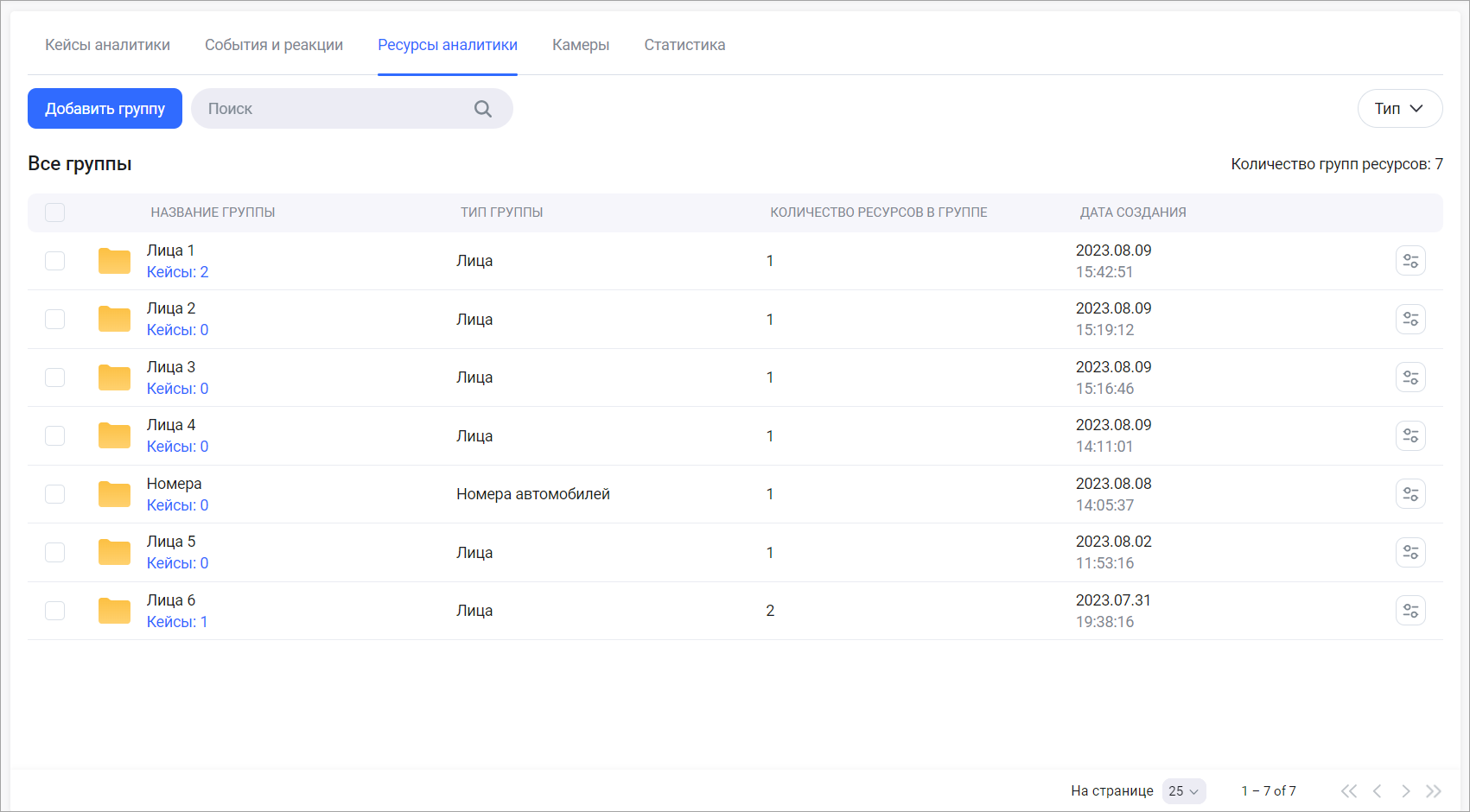 Фильтр групп по типу («Лица», «Номера автомобилей»)
