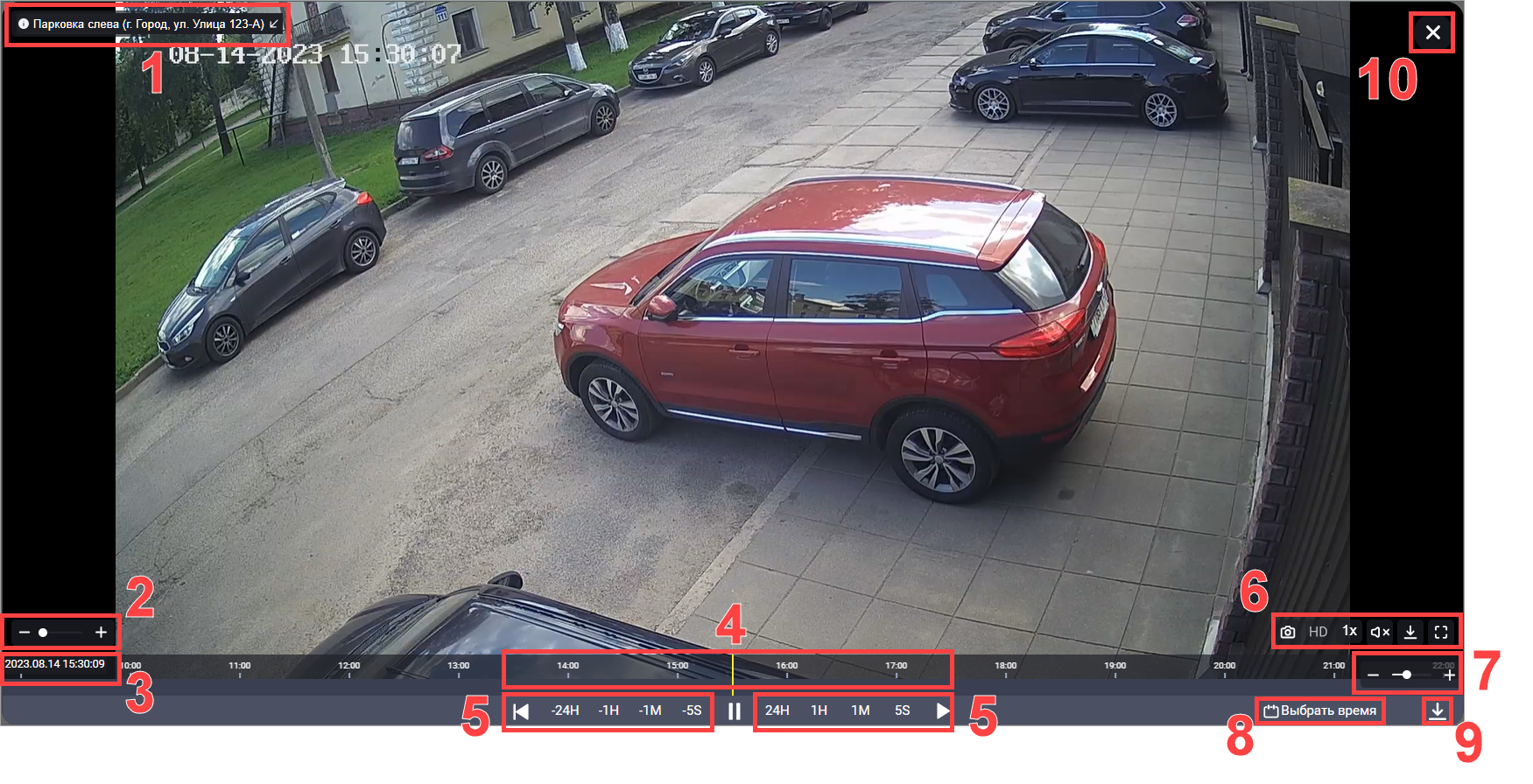Используется для навигации по архиву. Отображает изменяемую шкалу с временными метками. Также на таймлайне отображаются события.