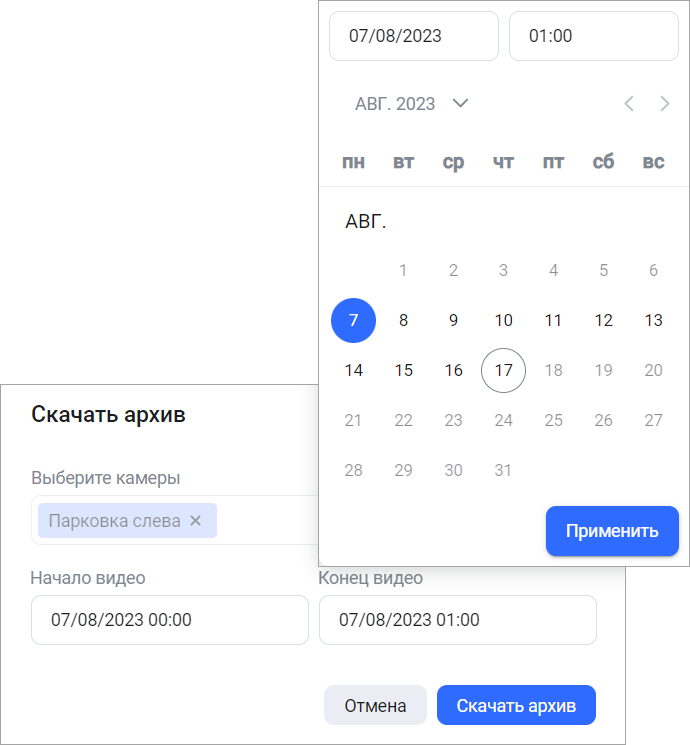 Выберите год, месяц и день, укажите время и нажмите «Применить». Дни, в которые не велась запись архива, недоступны.