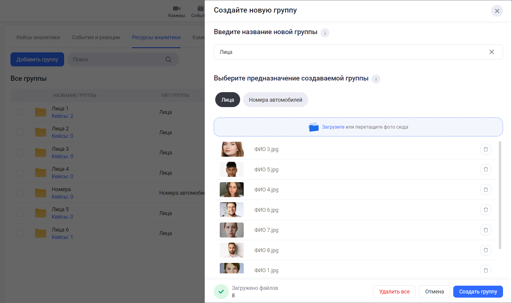 Группы ресурсов – это каталоги, содержащие эталонные изображения лиц и буквенно-численные комбинации номерных знаков, которые используются в кейсах аналитики с видом «Распознавание лиц» и «Распознавание номерных знаков» соответственно.
