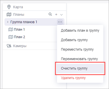 Функция «Очистить группу» предназначена для очистки группы планов, удаляя все добавленные в нее планы. Также будут удалены все дочерние группы планов вместе с планами, если они присутствуют.