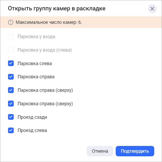 Функция позволяет открыть камеры группы в новой раскладке для одновременного просмотра трансляций с выбранных камер. Допускается выбор не более шести камер.