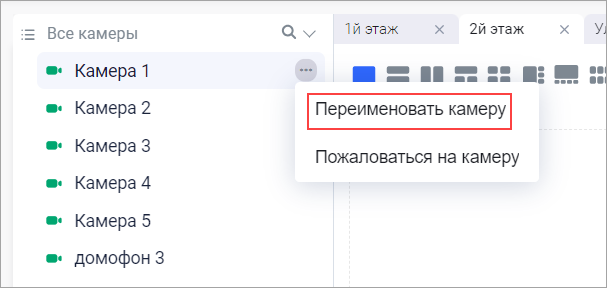 Чтобы открыть контекстное меню, наведите курсор на название камеры и нажмите на иконку «Управление».