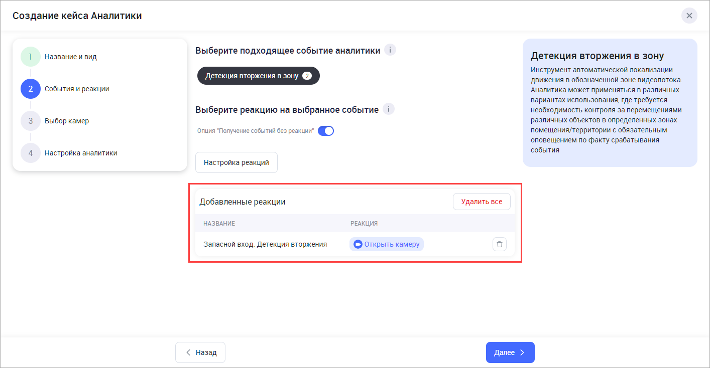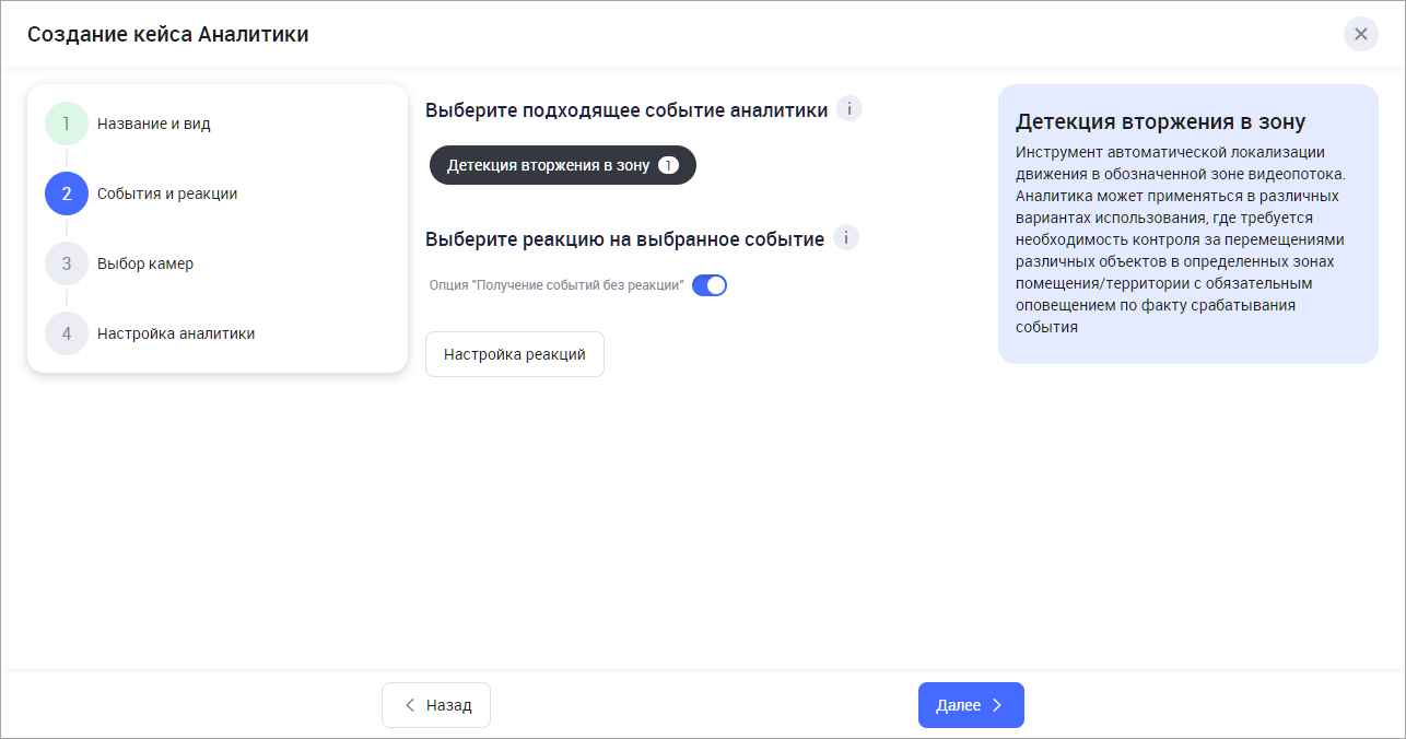 На данном шаге настраивается общий список событий и реакций на события. Далее на Шаге 4 при настройке аналитики вы сможете выбрать из этого списка события и реакции при настройке каждой камеры отдельно.