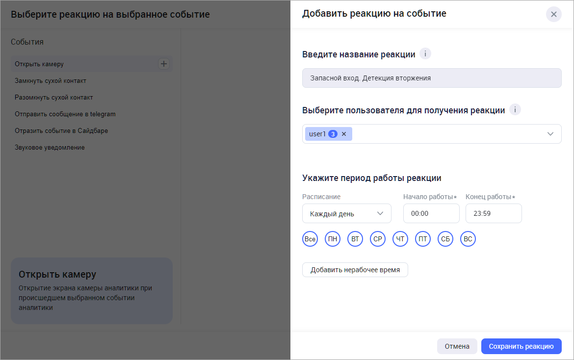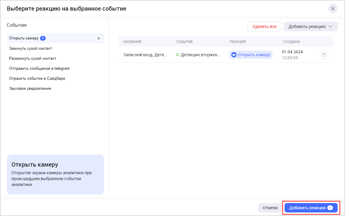 В результате созданная реакция отобразится в списке реакций выбранного типа. Для того, чтобы далее использовать созданную реакцию при настройке камер, нажмите «Добавить реакции».