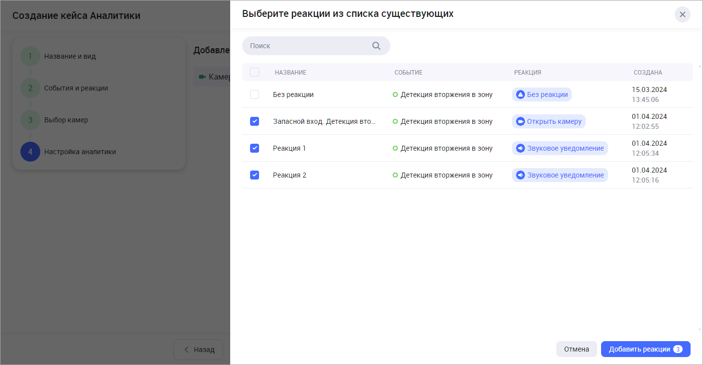 В результате выбранные реации отобразятся в списке реакций выбранного типа для текущего кейса. Для того, чтобы далее использовать созданную реакцию при настройке камер, нажмите «Добавить реакции».
