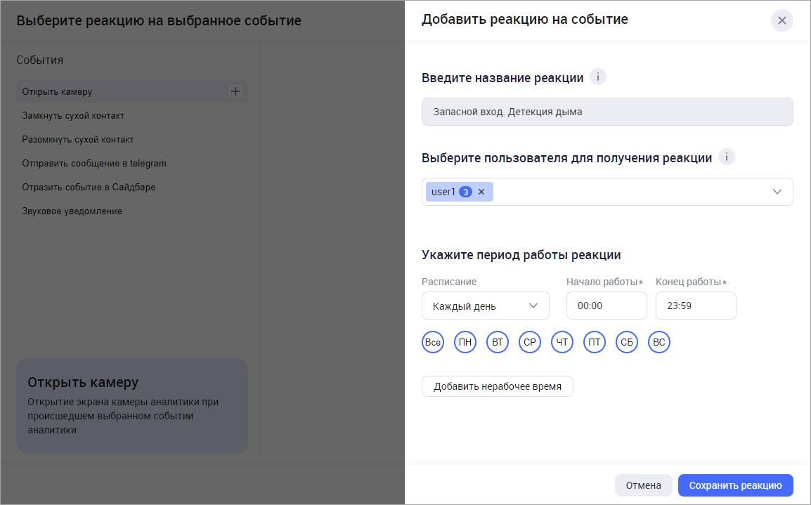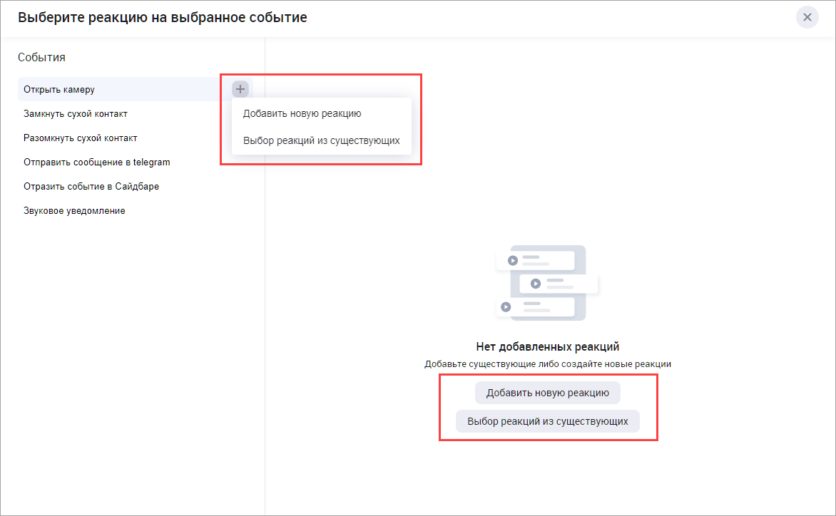 В результате созданная реакция отобразится в списке реакций выбранного типа. Для того, чтобы далее использовать созданную реакцию при настройке камер, нажмите «Добавить реакции».