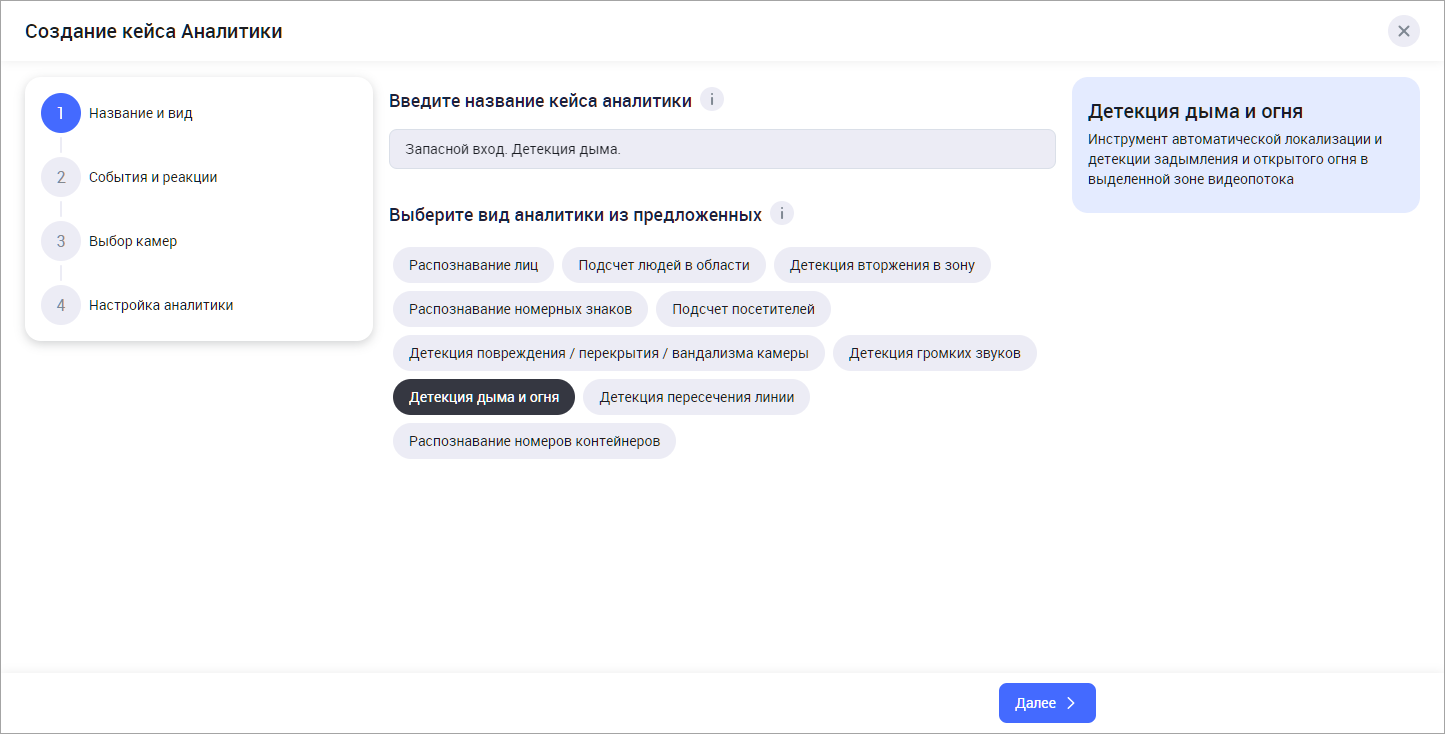 Вид аналитики «Детекция дыма и огня» предназначен для детекции дыма и/или огня в заданной области.