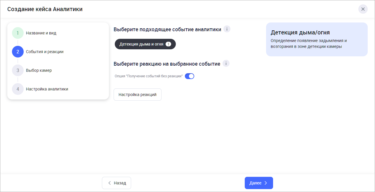 При необходимости включите опцию «Получение событий без реакции». Если при настройке камеры на Шаге 4 опция будет добавлена в список реакций, то при наступлении события никаких дополнительных оповещений поступать не будет. При этом событие будет отображено в общем списке событий при просмотре кейса аналитики.