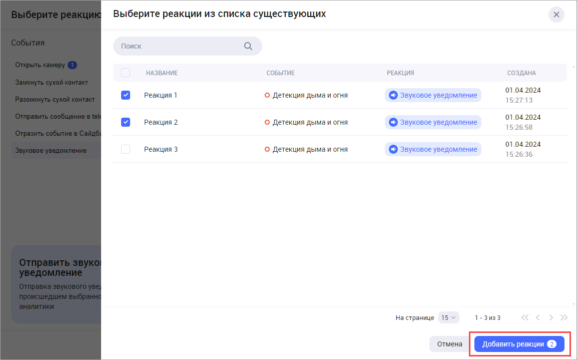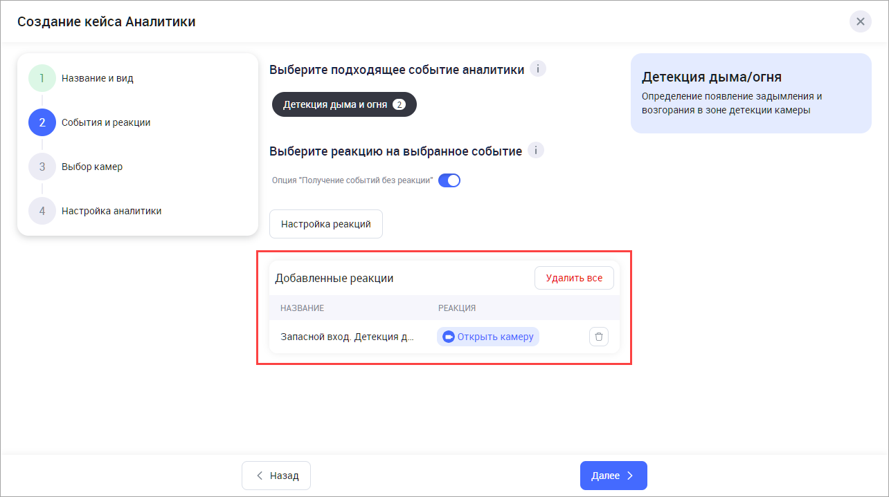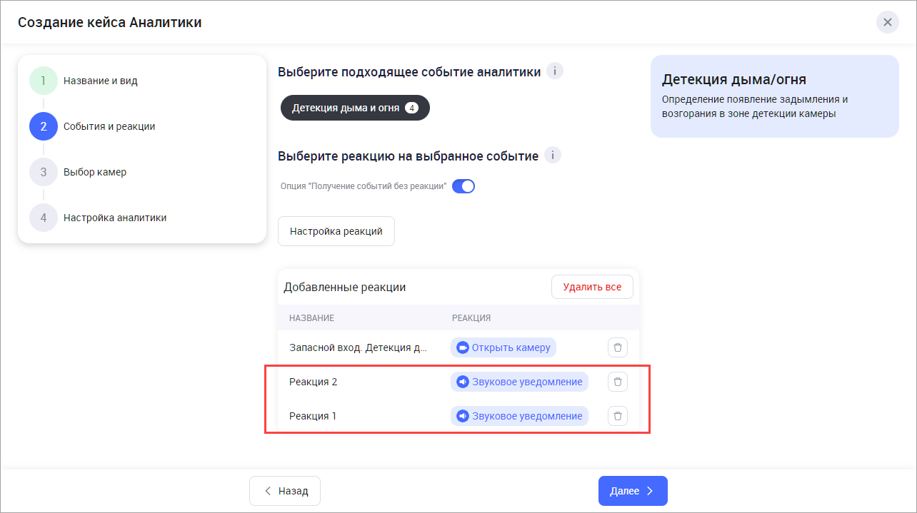 В результате выбранные реации отобразятся в списке реакций выбранного типа для текущего кейса. Для того, чтобы далее использовать созданную реакцию при настройке камер, нажмите «Добавить реакции».