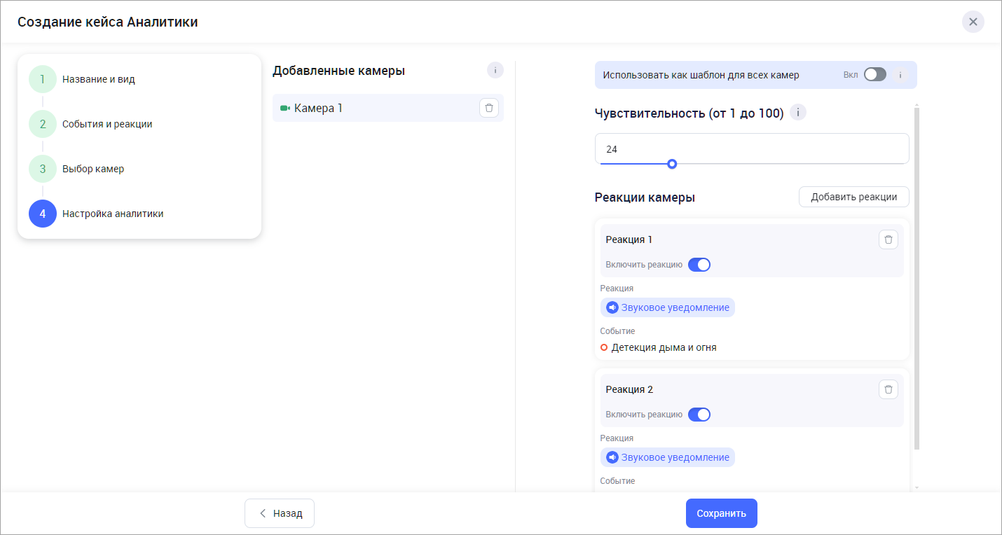 По умолчанию каждой камере назначаются все реакции, добавленные в текущий кейс аналитики на Шаге 2. При необходимости отредактируйте список реакций.