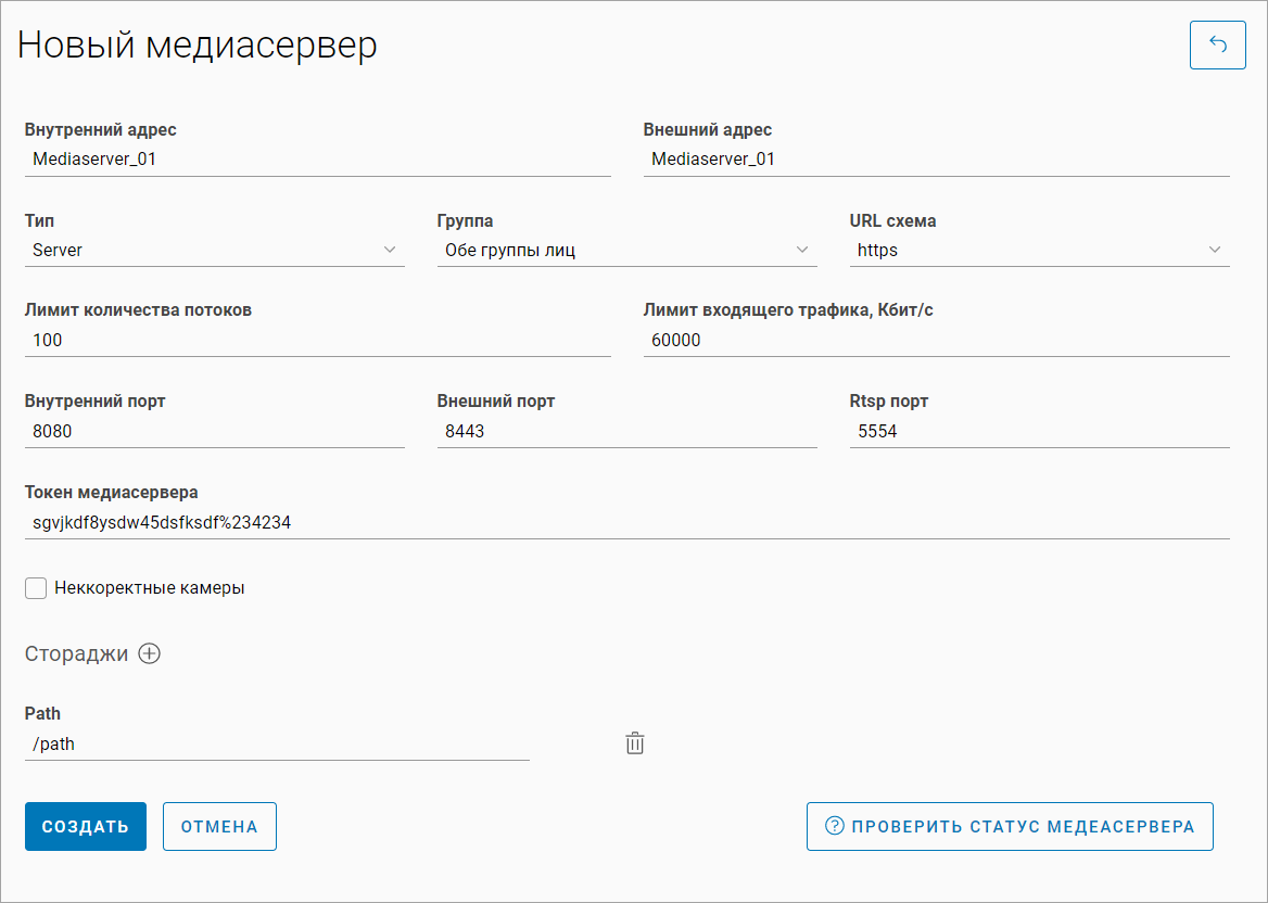 При создании медиасервера, а также при нажатии кнопки «Проверить статус медиасервера» выполняется запрос доступности медиасервера по указанному адресу и внутреннему порту.