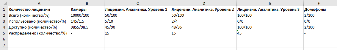 Содержит информацию о количестве лицензий в разрезе всего/использовано/доступно/распределено: