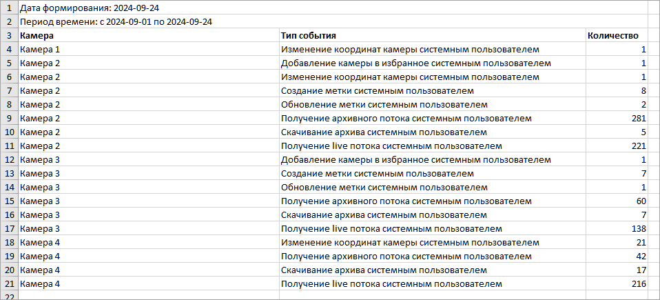 Типы событий, по которым формируется отчет, приведены в разделе «Действия пользователей. Просмотр камеры».
