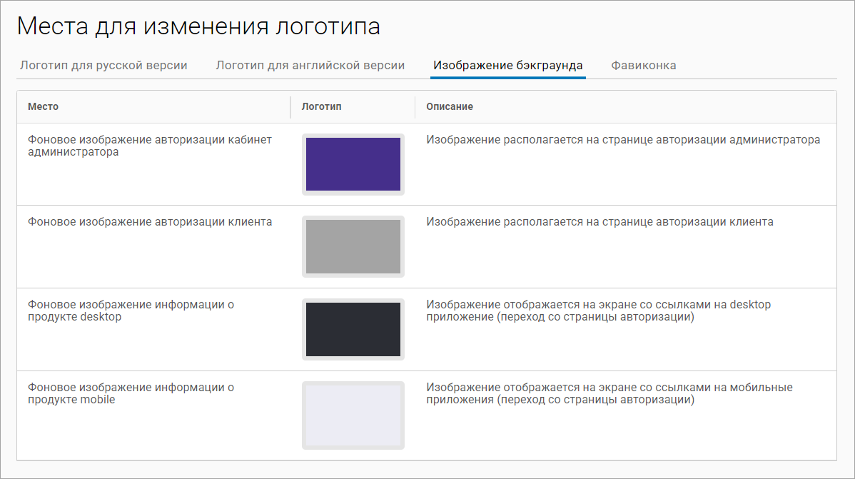 Вкладка «Изображение бэкграунда» предназначена для загрузки фоновых изображений (бэкграунда), которые отображаются в Web-интерфейсах администратора и пользователя на странице авторизации.