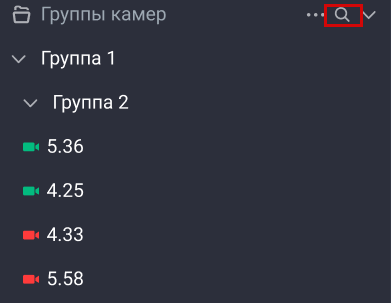 Поиск происходит через поле поиска папки «Группы камер» по наименованию камеры и наименованию группы. По мере ввода наименования в списке отображаются только соответствующие камеры и/или группы.