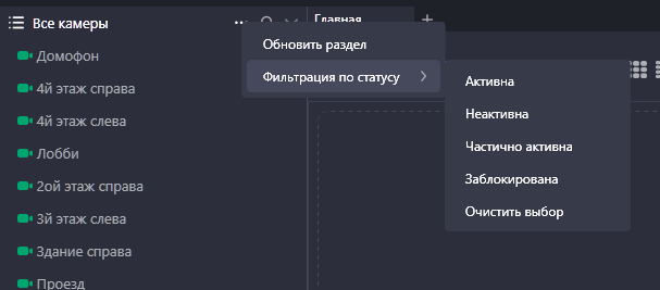 Фильтрация камер с помощью фильтра по статусу: «Активна», «Неактивна», «Частично активна». Для отмены фильтрации используйте «Очистить выбор».