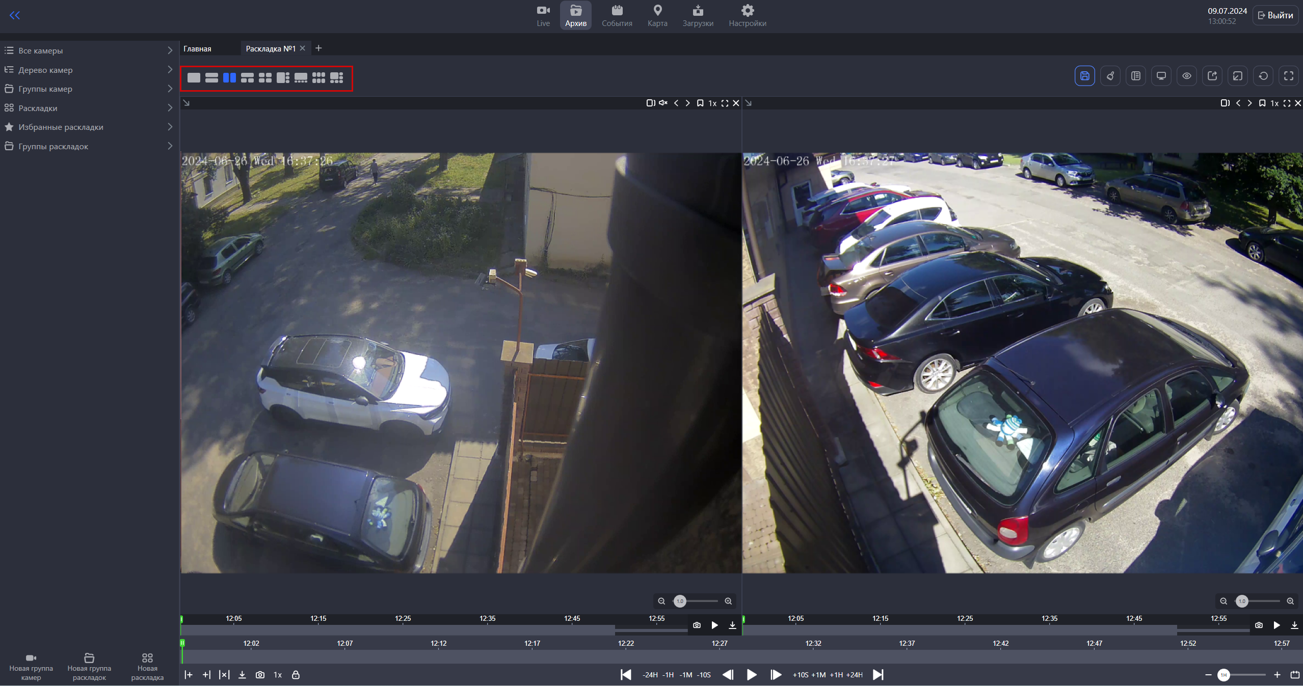 В настройках программы предусмотрена функция «Показывать все шаблоны раскладок архива». При включении данной функции, в разделе «Архив» пользователю будут доступны шаблоны, с максимальным количеством камер – 16. Если настройка выключена, то будут доступны шаблоны, включающие максимум 6 камер.