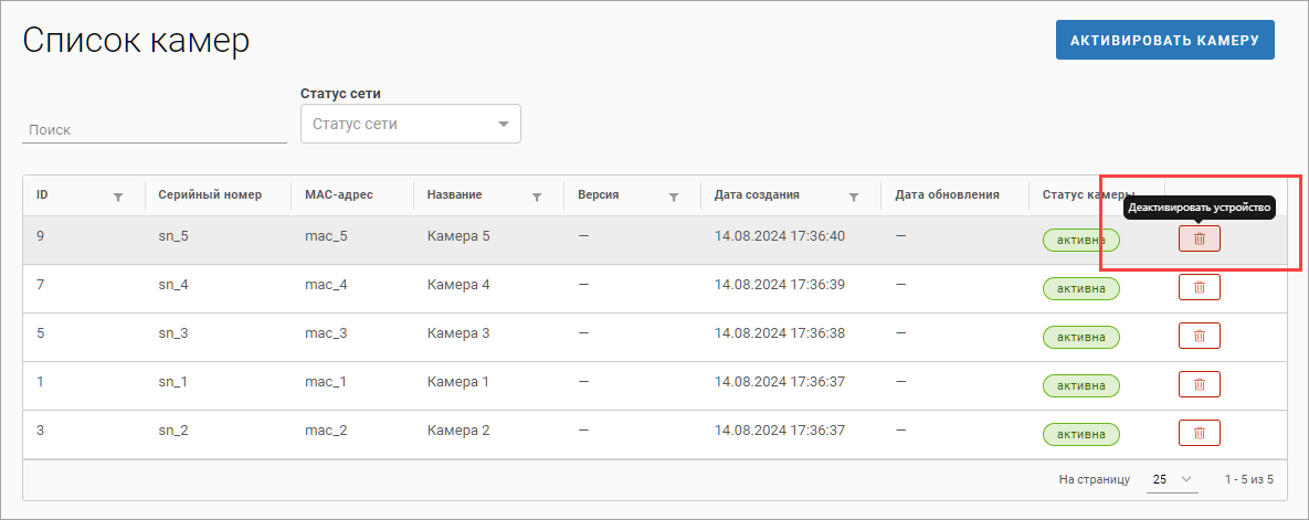 В результате успешной активации камера будет доступна указанному пользователю для дальнейшего управления, а также будет отображаться в интерфейсе администратора в списке добавленных камер с доступом к общей информации.