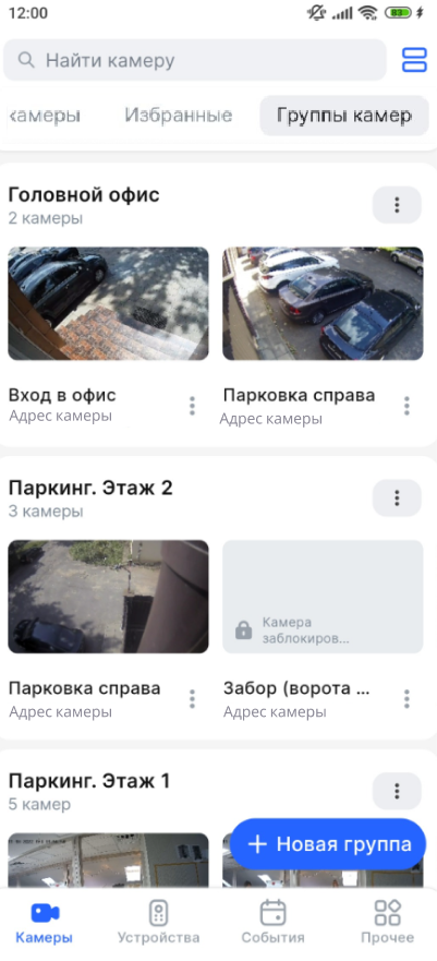Пользователю мобильного приложения в разделе «Камеры» доступны камеры видеонаблюдения на вкладках «Все камеры», «Избранные» и «Группы камер», сгруппированные по различным критериям.