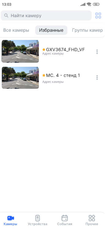 В разделе «Камеры» на вкладке «Избранные» отображены все камеры, которые пользователь приложения отметил как избранные.