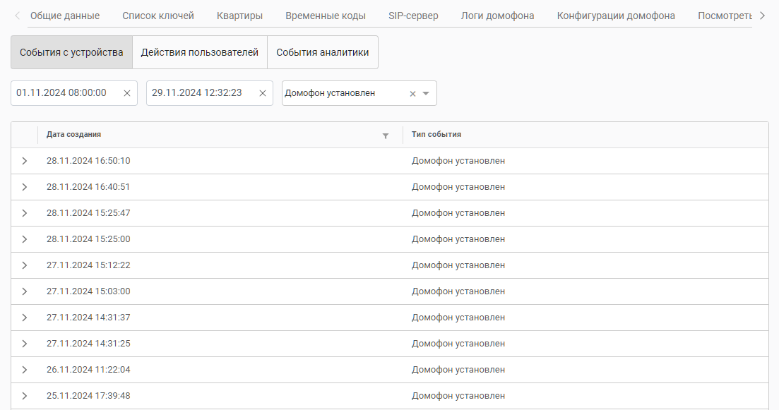 Вкладка «События» предназначена для просмотра событий различных типов для текущего домофона:
