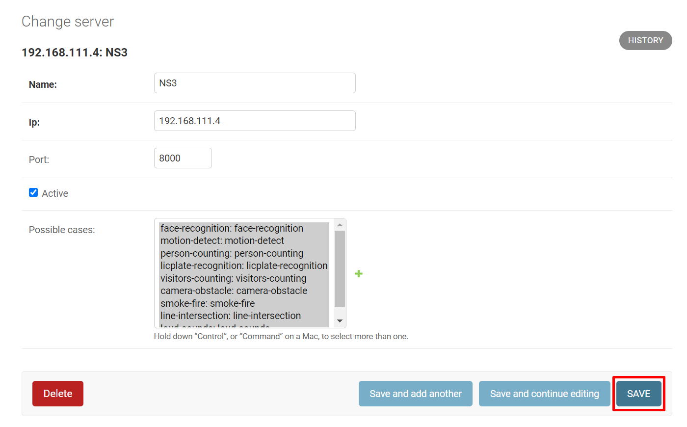 «Save and add another», чтобы после редактирования сервера сразу же добавить новый сервер. В данном случае откроется окно добавления
