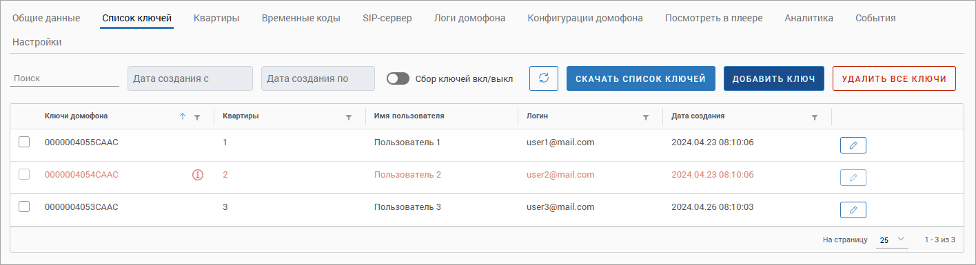 Если к пользователю привязан ключ, но при этом у пользователя отключено разрешение открывать дверь чип-ключом (см. вкладку «Квартиры»), то строка с ключом выделяется красным цветом.