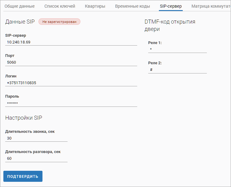 Вкладка «SIP-сервер» домофона «Интерсвязь»