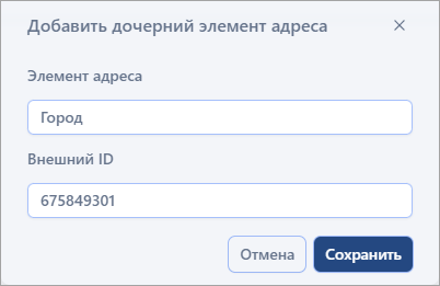 Внешний ID – уникальный ID элемента адреса, присваивается заказчиком.
