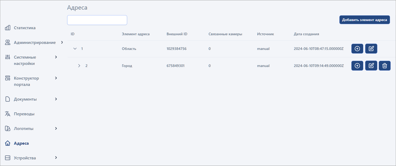 Создание адреса возможно только после формирования структуры адреса в разделе «Конструктор портала» → «Конструктор адресов». Под структурой адреса понимается иерархический набор полей с заданным уровнем вложенности.