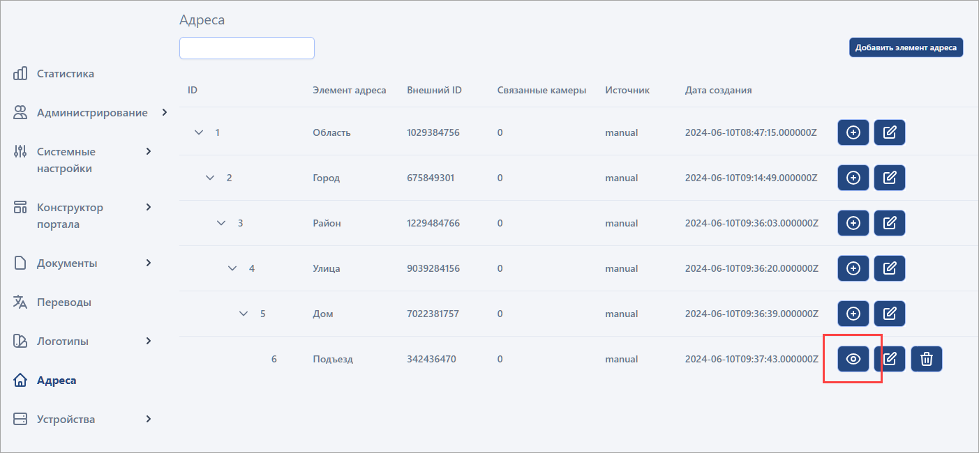 Для редактирования конечного элемента адреса нажмите кнопку редактирования в нужной строке.