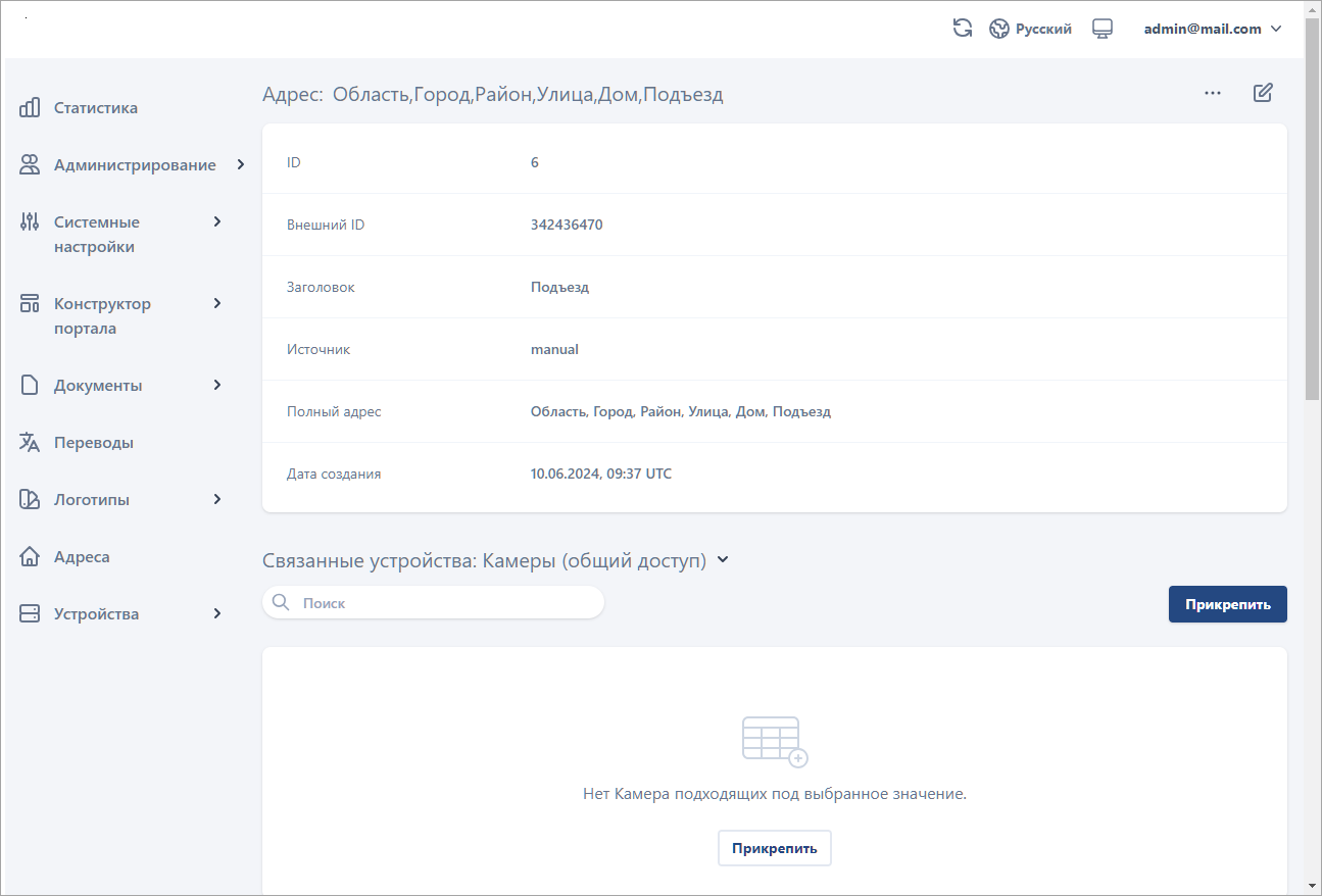 Привязка камеры к адресу также может выполняться в разделе «Устройства» → «Камеры» при просмотре карточки камеры.