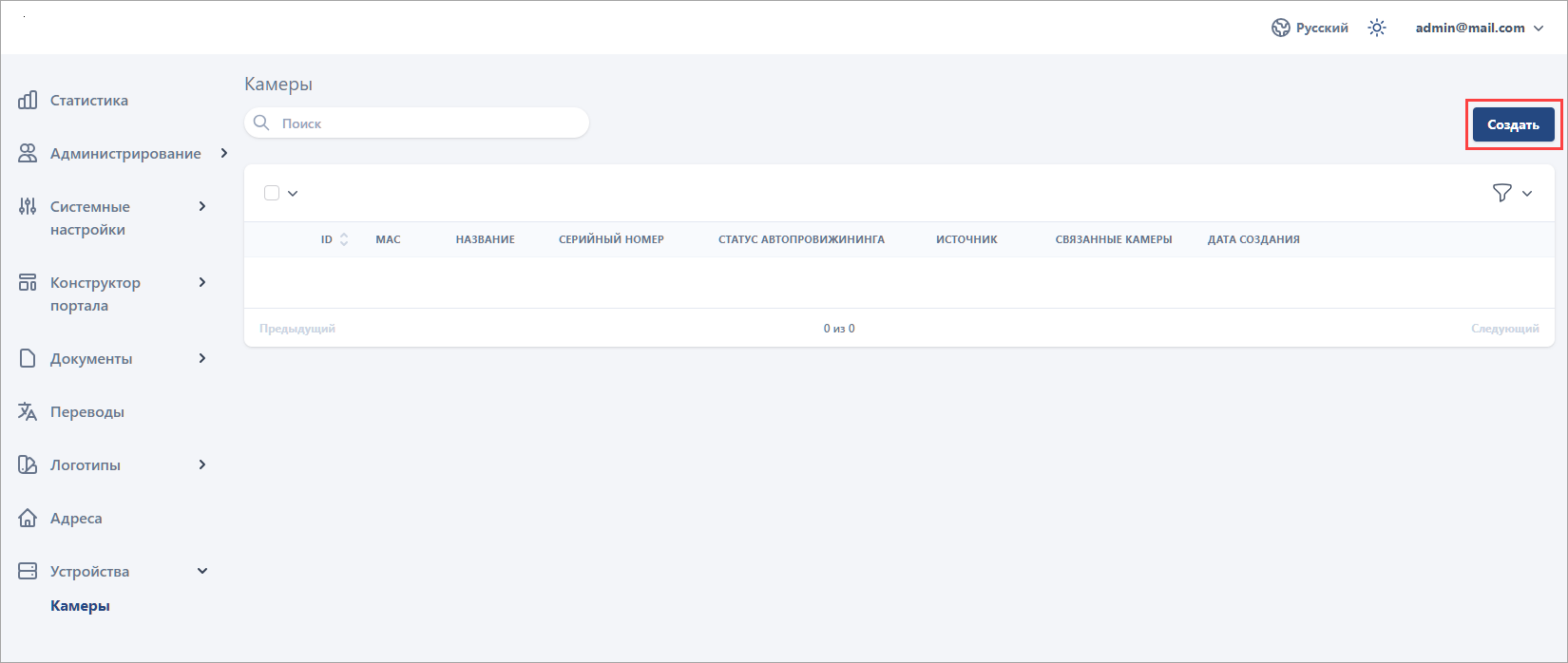 Переход в карточку камеры для просмотра. Для этого нажмите на значение в колонке ID либо на кнопку просмотра