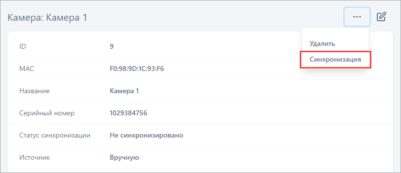 В карточке камеры нажмите на «…» в правом верхнем углу и выберите пункт «Синхронизация».