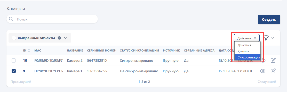 При просмотре списка камер выделите одну или несколько камер, которые связаны с адресами, нажмите «Действия» и выберите пункт «Синхронизация».