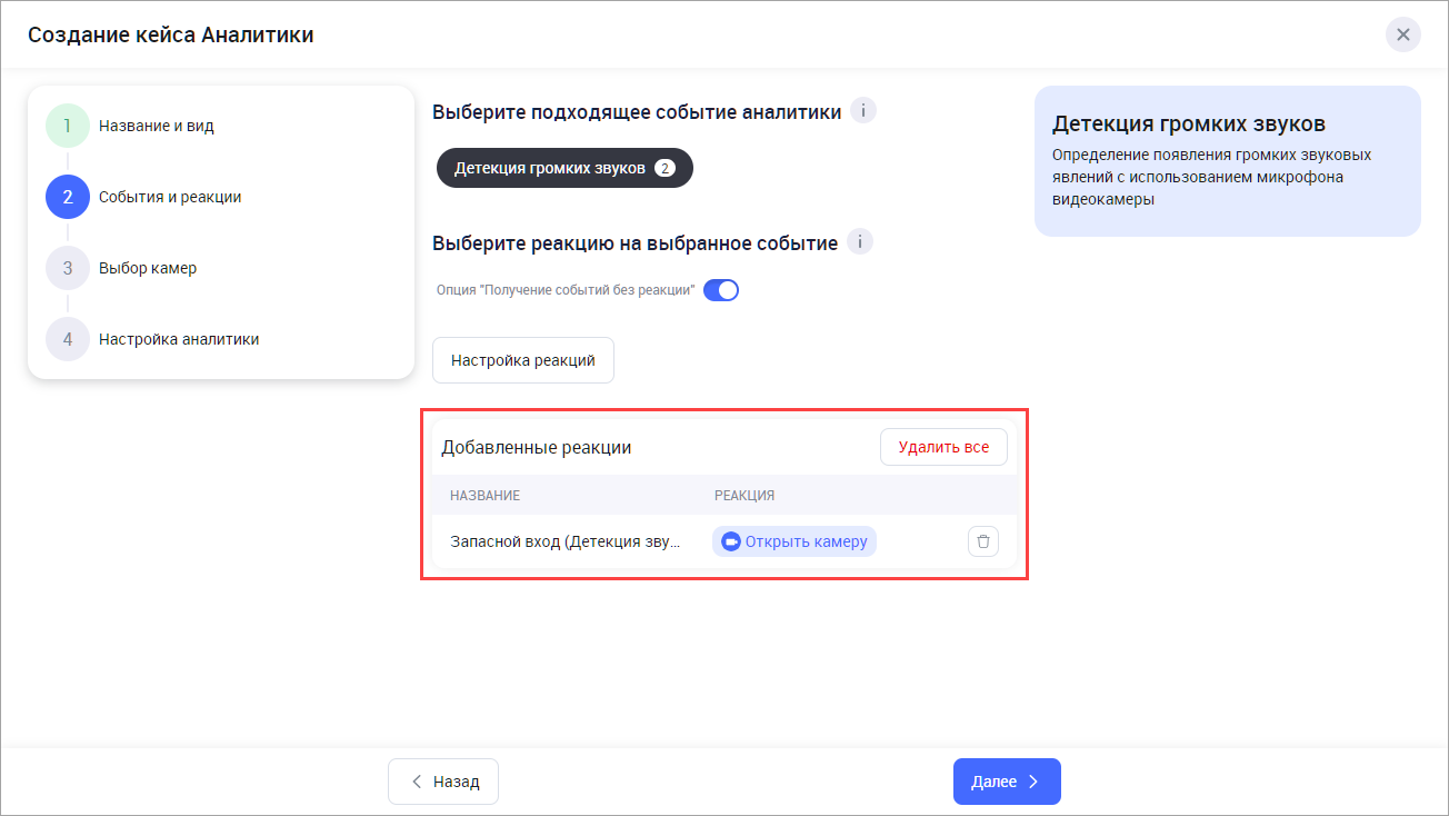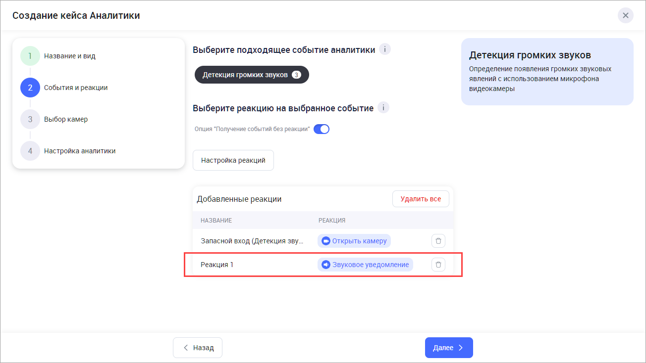 • В результате реакция отобразится в списке добавленных реакций в текущий кейс аналитики. Впоследствии её можно отключить либо удалить на Шаге 4 при добавлении либо редактировании кейса.