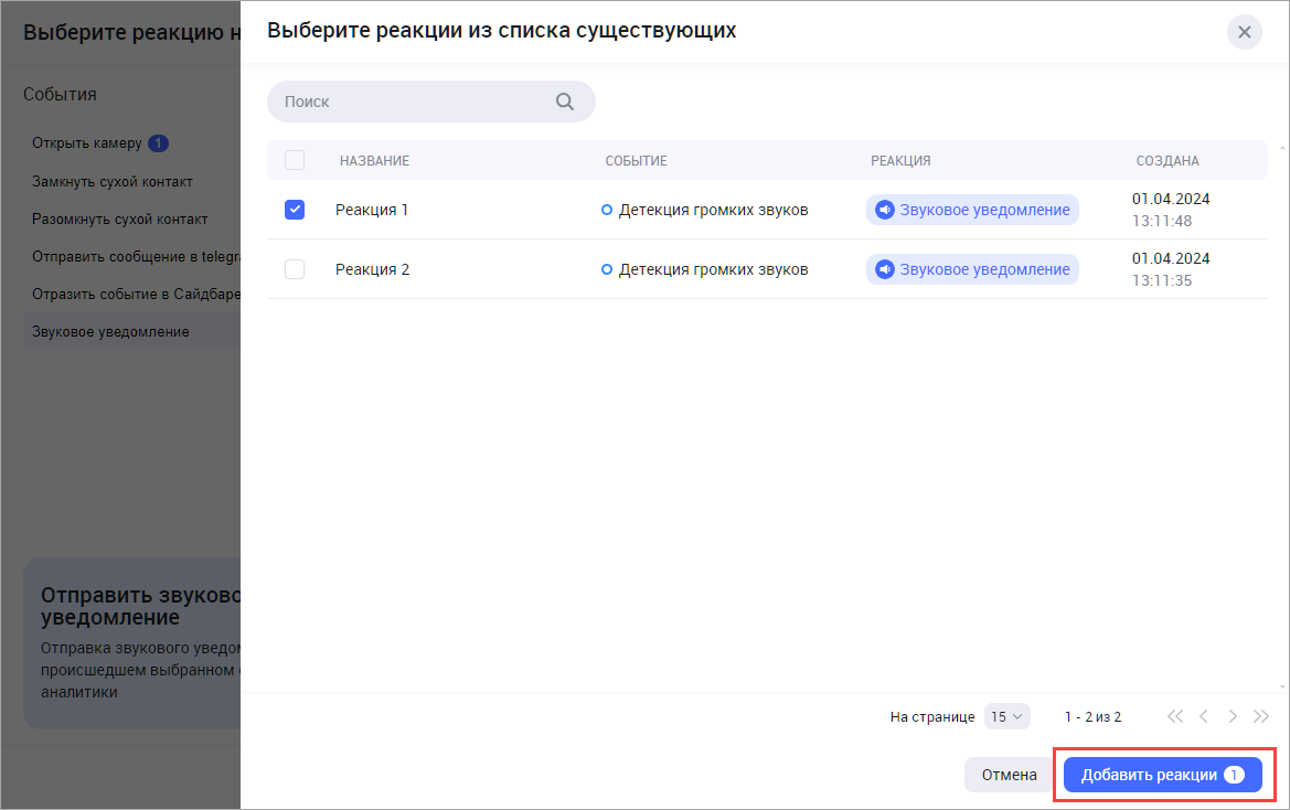 В результате выбранные реации отобразятся в списке реакций выбранного типа для текущего кейса. Для того, чтобы далее использовать созданную реакцию при настройке камер, нажмите «Добавить реакции».