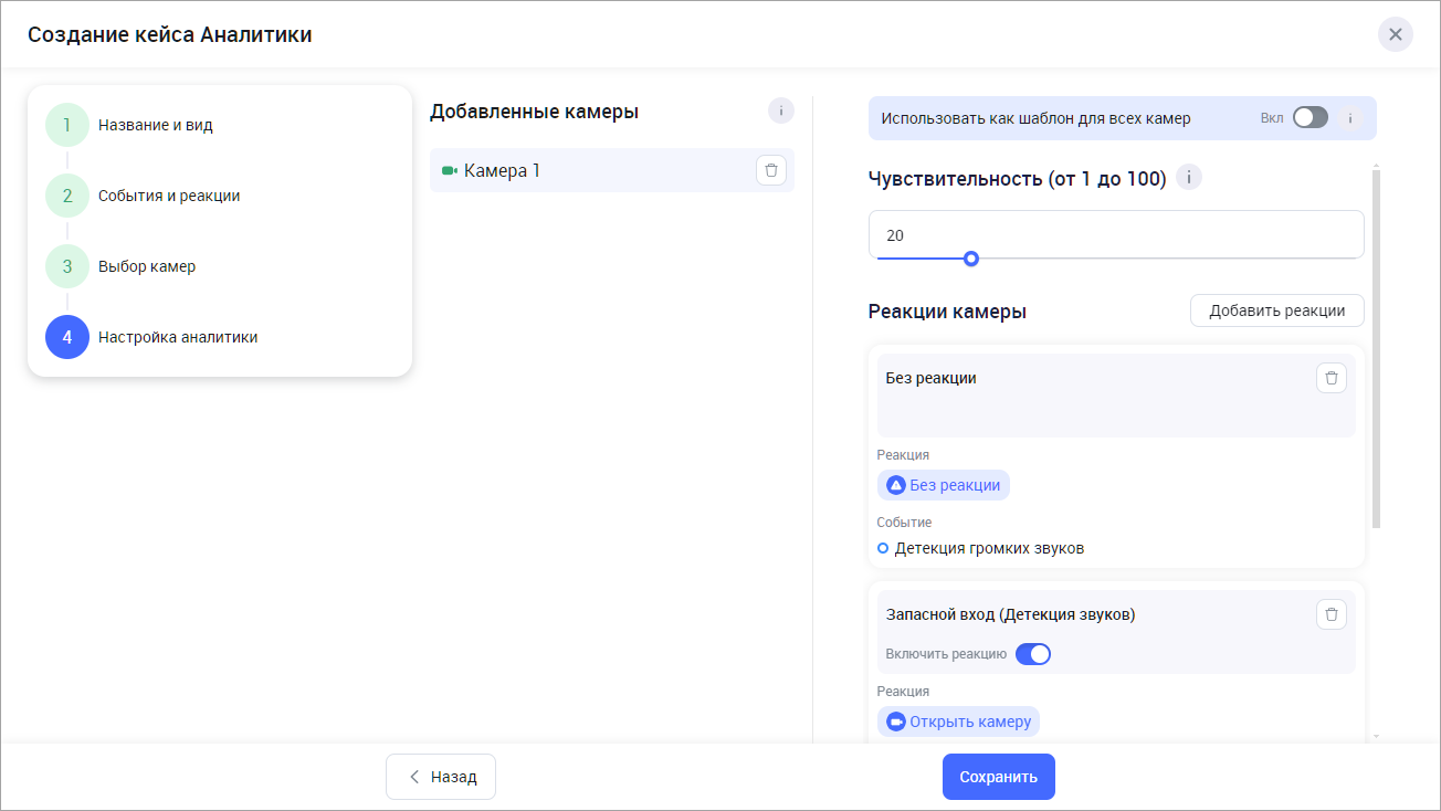 По умолчанию каждой камере назначаются все реакции, добавленные в текущий кейс аналитики на Шаге 2. При необходимости отредактируйте список реакций.