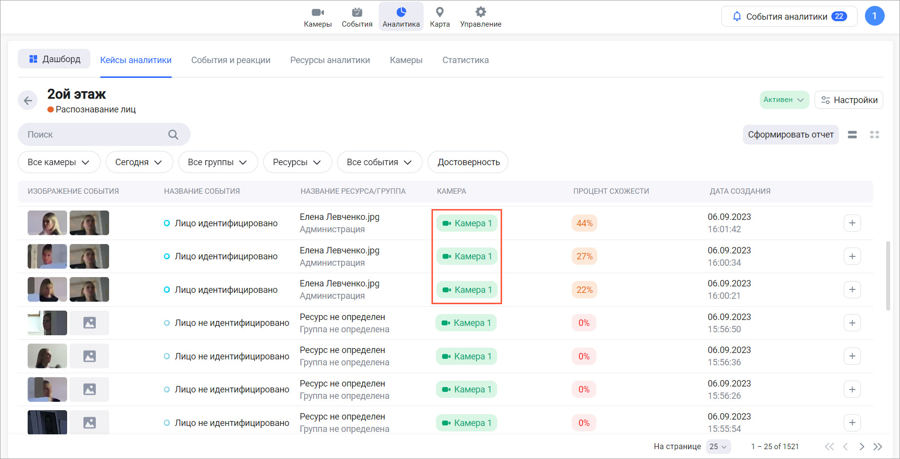 При просмотре кейсов отображается таблица с перечнем событий. Для каждого события указана камера, которая зафиксировала событие. Цветом выделяется статус камеры.