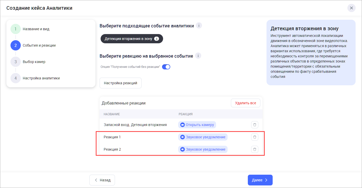 В результате выбранные реакции отобразятся в списке реакций выбранного типа для текущего кейса. Для того, чтобы далее использовать созданную реакцию при настройке камер, нажмите «Добавить реакции».