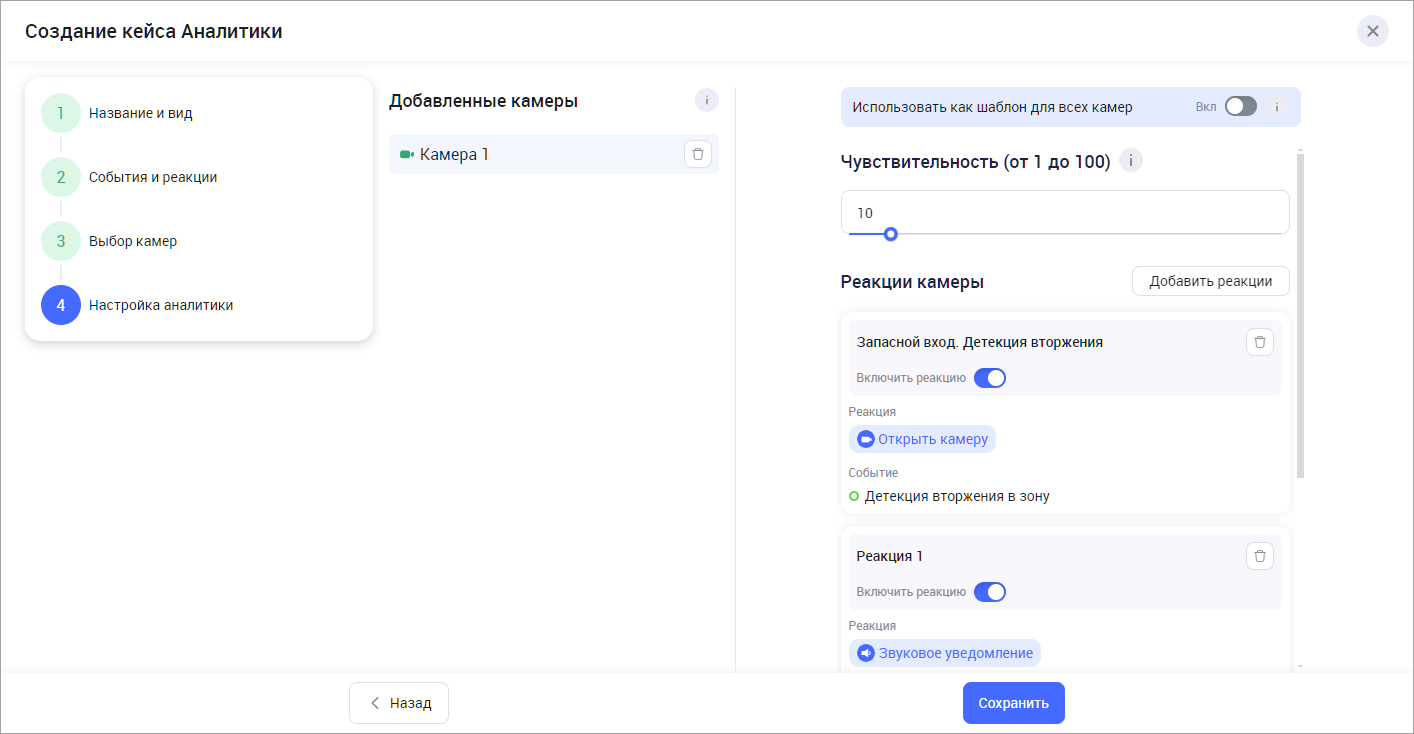 На данном шаге настраивается общий список событий и реакций на события. Далее на Шаге 4 при настройке аналитики вы сможете выбрать из этого списка события и реакции при настройке каждой камеры отдельно.