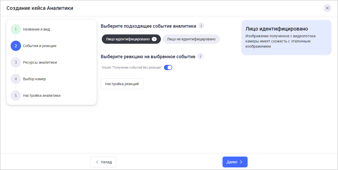 При необходимости включите опцию «Получение событий без реакции». Если при настройке камеры на Шаге 5 опция будет добавлена в список реакций, то при наступлении события никаких дополнительных оповещений поступать не будет. При этом событие будет отображено в общем списке событий при просмотре кейса аналитики.