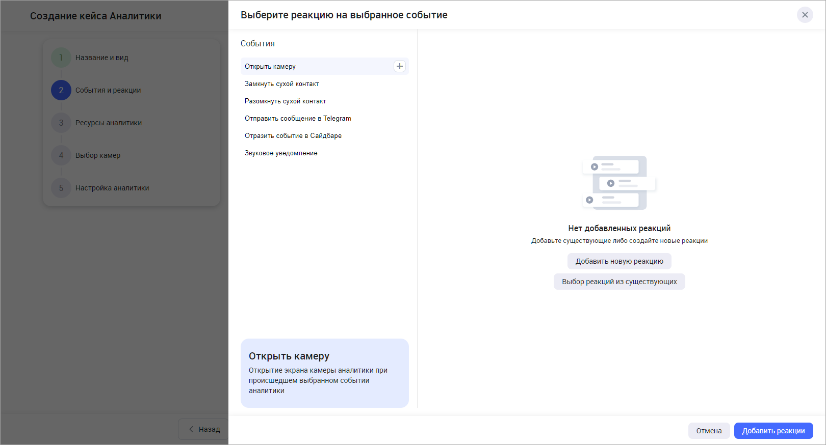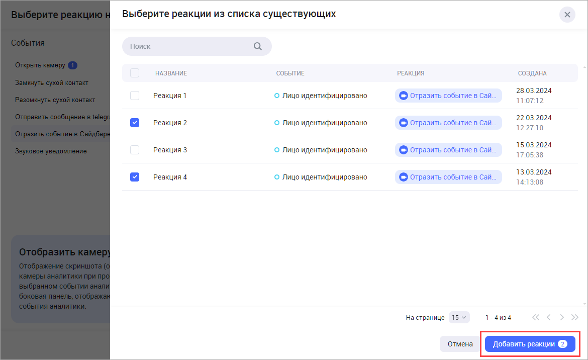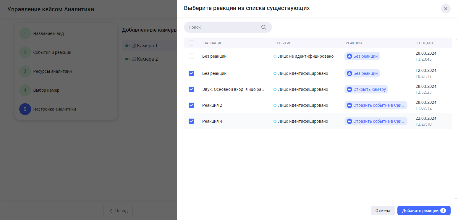 В результате выбранные реации отобразятся в списке реакций выбранного типа для текущего кейса. Для того, чтобы далее использовать созданную реакцию при настройке камер, нажмите «Добавить реакции».