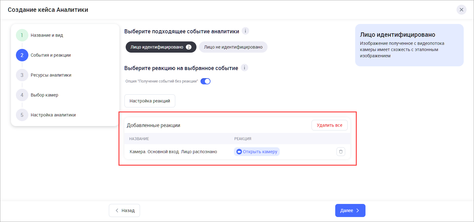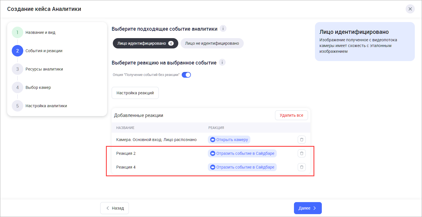 В результате выбранные реакции отобразится в списке добавленных реакций в текущий кейс аналитики. Впоследствии их также можно отключить либо удалить на Шаге 5 при добавлении либо редактировании кейса.