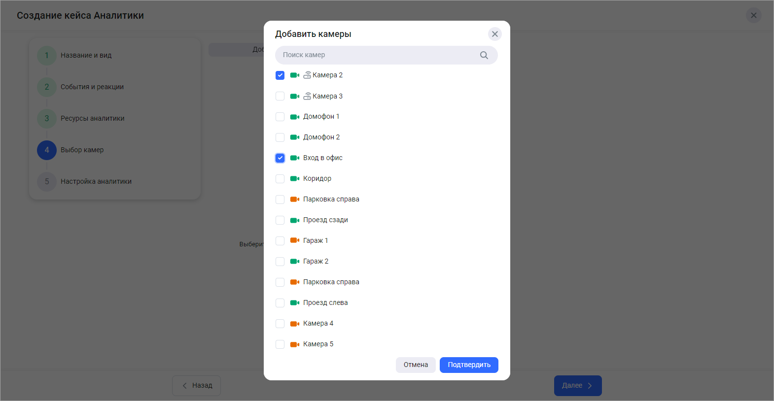 Выберите камеры из списка и нажмите «Подтвердить»