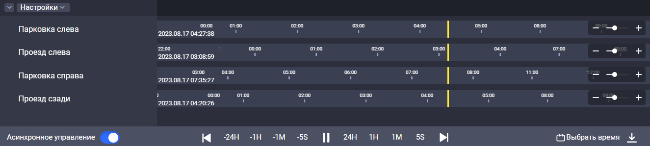 В нижней части рабочей области отображается список таймлайнов для всех камер. Управление временем просмотра зависит от переключателя «Асинхронное управление».
