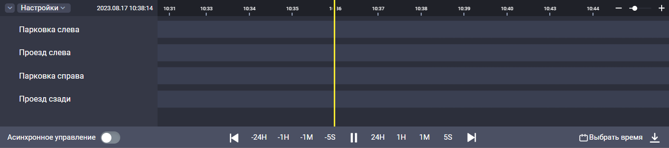 Если асинхронное управление выключено, то выполнятся одновременное управление временем на всех таймлайнах. Соответственно, для всех камер устанавливаются единые дата и время просмотра архива. При этом отображается только общая временная шкала и общие дата и время просмотра.