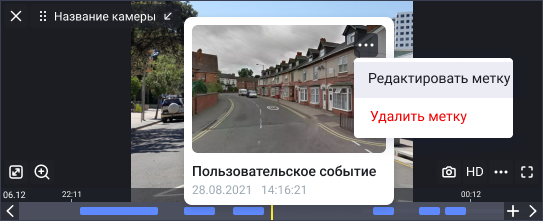 В системе предусмотрено добавление пользовательских событий и отображение их меток на таймлайне камеры.